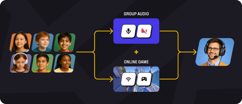 Groups of similar-age kids play, talk, and learn online with a trained educator